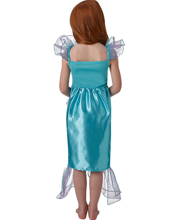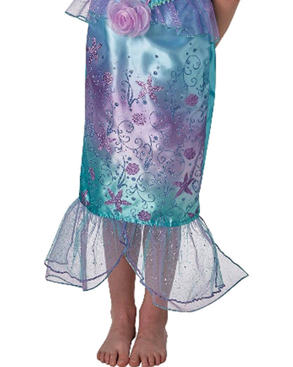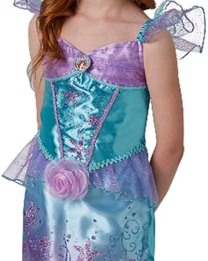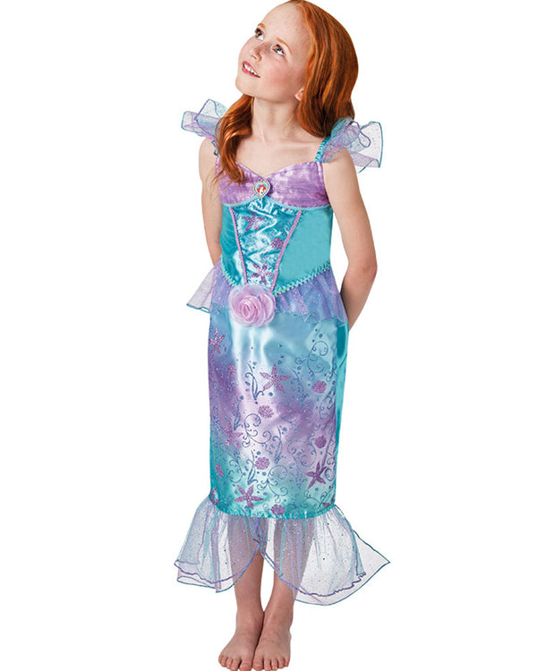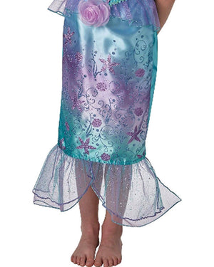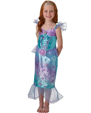 You are the princess of the sea, so you will need to look the part, which is why this Disney Ariel Rainbow Deluxe Girls Costume will be perfect. The costume comes complete with a beautiful purple and aqua blue dress with a gold tiara to show you are a true princess. The dress comes in a satin finish and features a purple sweetheart neckline with a heart-shaped pendant of Ariel. The bodice comes in aqua blue with purple glitter detailing. Aqua blue elastic straps attached to the neckline with purple organza to give layered flutter sleeves. Skirt features purple and blue glitter print of sea life and around the top is purple organza to match sleeves and in the centre is a pink tulle rose. Along the hemline is purple glitter tulle shaped into a fin, for a tail effect. To finish the look, place the plastic gold tiara with purple gems into your head.