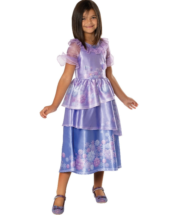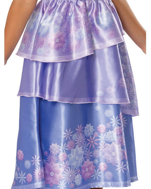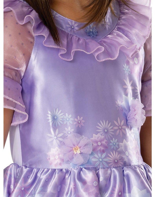 Grow your power with our Disney Encanto Isabela Deluxe Girls Costume. Inspired by the powerful Isabela, the golden child of the Madrigal family. Featuring an Isabela-themed dress with a purple bodice with a floral pattern, short tulle shoulder sleeves, a ruffled collar, and three attached fabric flowers. The skirt is multilayered with a full-length matte skirt underneath.