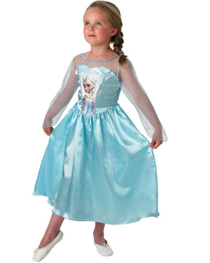 No need to hold it back anymore with our Classic Elsa Costume from the Disney film, Frozen. Elsa is the ruler of Winter, known as the Snow Queen of Arendelle and sister of Princess Anna, who turns the kingdom to eternal ice and snow. Our costume features a pretty pale blue satin princess style dress adorned with a cameo of Elsa on the chest and long sparkly see through sleeves. Great for make believe dress up play and parties!