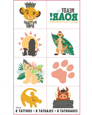 Every Lion King party needs our Disney Lion King Tattoos Pack of 8! Hand out our temporary lion king tattoos at your son's Lion King themed birthday party. The party favour features a pack of 8 temporary tattoos with fun images including Simba, Pumba, Timon and Mufasa. For a coordinated look check out our range of Lion King party supplies including favours, décor and tableware!