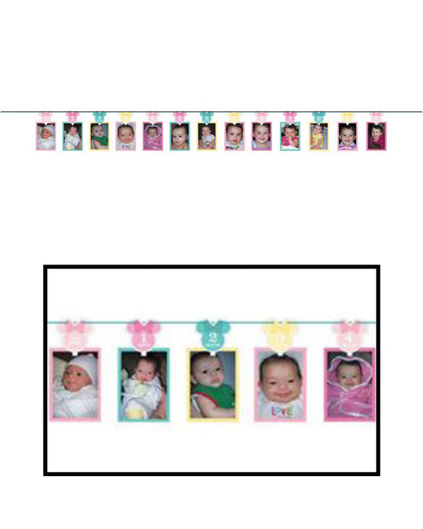 Show off your adorable birthday girl when you place pictures of her on this Disney Minnie Fun to be One Photo Garland and hang for all your guests to see. The garland features a long pink ribbon, pale pink, yellow, aqua, and pink cutouts of Minnie with white numbers and attached white pegs! In addition, the pack features 13 multicoloured rectangle cutouts where you can place photos of your little one with the included adhesive. Perfect for showing everyone how much your little princess has grown, from birth to the age they are now. Combine with our other Disney Minnie Fun to be One party supplies including party cups, party plates, tablecovers and more.