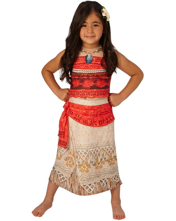 Set sail for adventure in this Disney Moana Deluxe Girls Costume. The officially licensed costume comes with a dress featuring Moana's necklace printed on the front and a printed skirt with an attached matching waist sash. The dress has a mesh insert at the waist. A flower hairpin is also included to complete the look!
