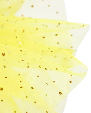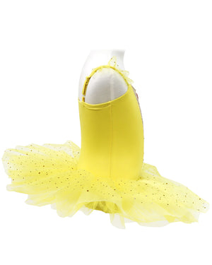 Fans of Beauty and the Beast can sing to their heart's content with this Disney Princess Belle Sparkling Tutu Dress Girls Costume. The yellow bodice of the dress is made from a stretch jersey material to keep little princesses comfortable all day. The front features a gold sparkly sequin panel in the centre and character-printed heart gemstone on the neckline. Organza ruffles are attached to the shoulder straps. The tutu has an integrated leotard pant with a multi-layered tulle skirt in light yellow.