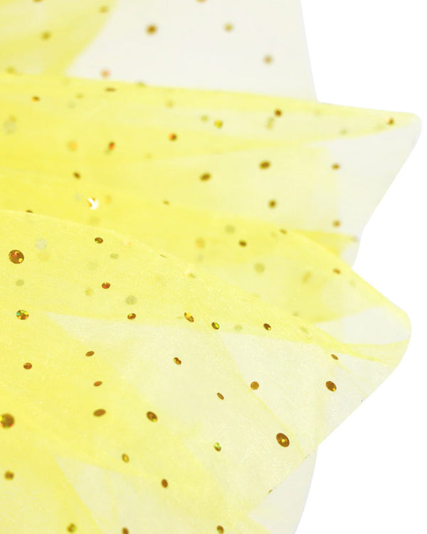The shoulder ruffles and skirt use new-and-improved organza which shimmers with light-reflecting holographic spots. This new design is free from glitter which means mess-free play and a costume that's better for the environment. Perfect for princess parties, Disney dress-ups, and cosy nights in watching Beauty and the Beast.