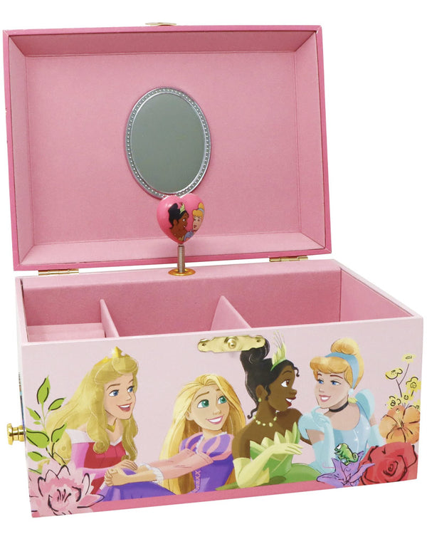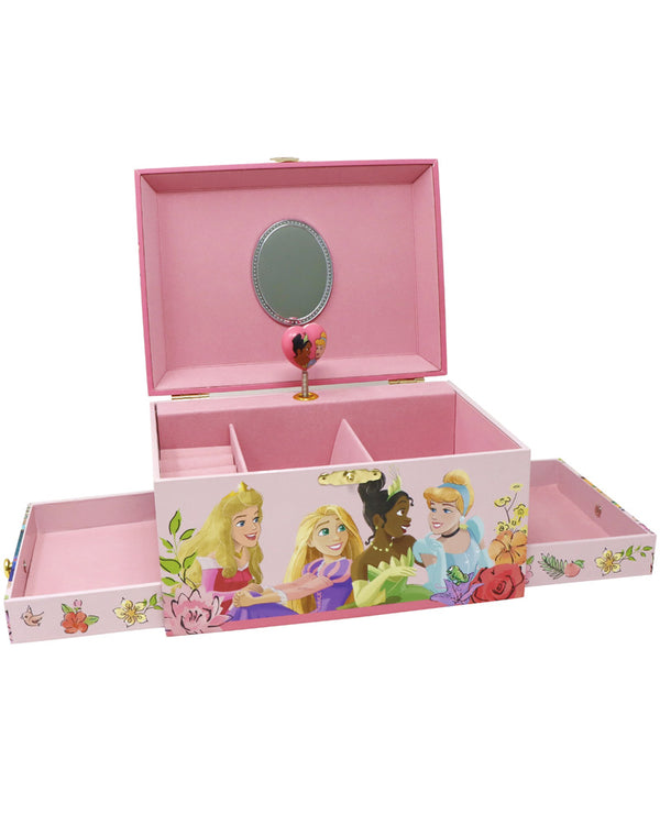 This Disney Princess Forever Friends Luxury Musical Jewellery Box is the perfect gift for the little princess in your life. It features a light-pink flocked lining interior to protect her precious jewellery, two side draws, a ring compartment, a divided jewellery compartment, a mirror, and a rotating printed heart figure that spins to the tune of Sleeping Beauty. The exterior features printed artwork of Disney Princesses on a pink background with a floral border.