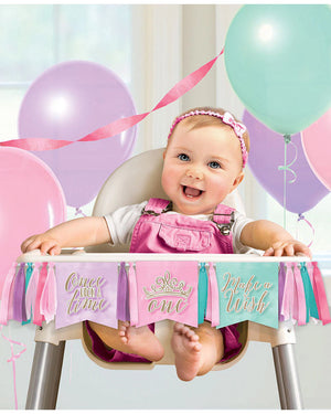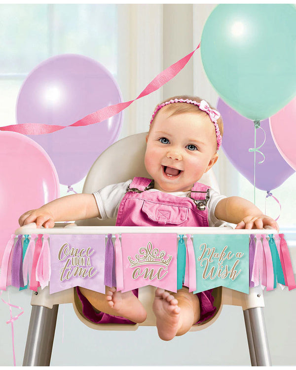Make your little one feel like a princess with this Disney Princess Once Upon A Time Deluxe High Chair Decorating Kit. Included is a banner featuring three pennant flags: one lilac reading 'once upon a time', one pink reading 'one' with an image of a crown and one mint green reading 'make a wish'. Separating each flag are attached ribbons in tulle, satin and grosgrain for added sparkle and fun! Easily attaches to a high chair to turn your little's ones space into one fit for a princess. Combine with our range of Disney Princess party supplies including party cups, party plates, tablecovers and more.