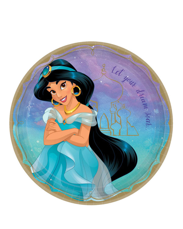 These Disney Princess Once Upon A Time Jasmine 23cm Plates Pack of 8 are perfect for your child's Princess themed birthday party. The plates are round and feature a purple to blue ombre background with a gold vintage-style border and an image in the center of Princess Jasmine from Aladdin sitting down and wearing her iconic blue two piece top and pants with a small headline that reads "Let your dream soar..." in purple. Place these cute Jasmine plates alongside your matching tableware to complete your child's birthday. Combine with our range of Dinsey Princess Once Upon a Time birthday party supplies including party cups, party plates, tablecovers and more.