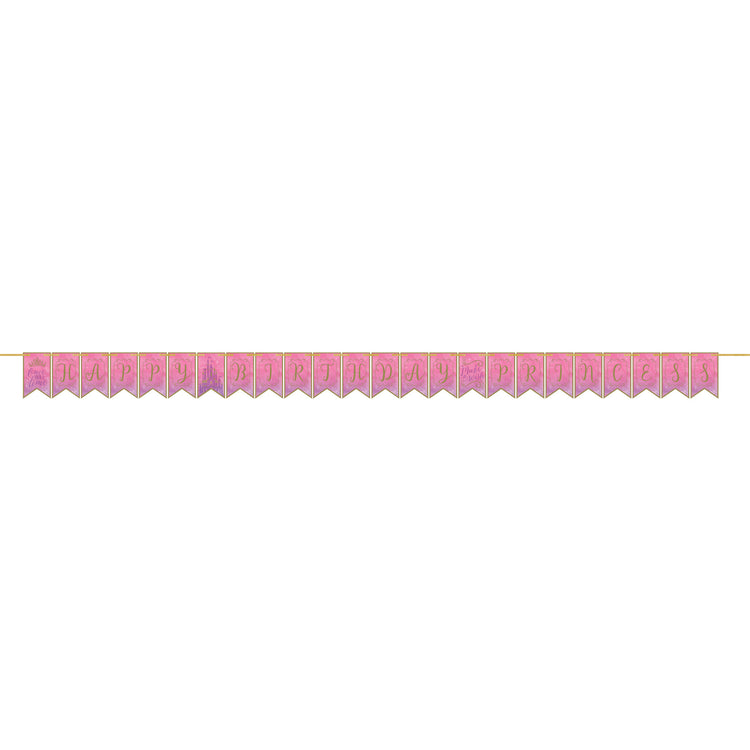 Make your little one feel like a princess with this Disney Princess Once Upon A Time Pennant Banner 4.5m. The banner features 24 individual pink pennants with the letters spelling out 'happy birthday princess' written in gold on each. There is also a pennant between each word with either a small quote or an image of a castle printed on them. Combine with our range of Disney Princess party supplies including party cups, party plates, tablecovers and more.