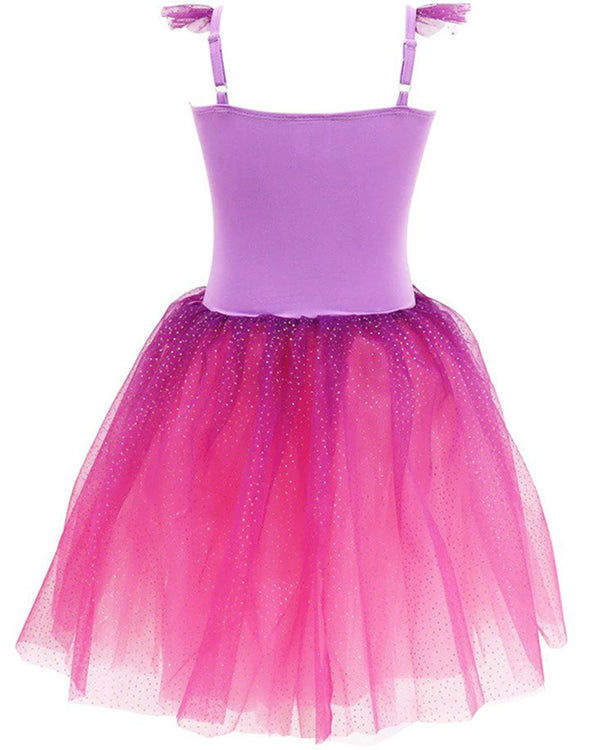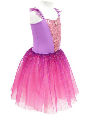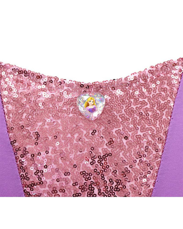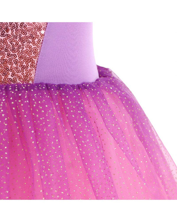 You'll love our Disney Princess Rapunzel Romantic Tutu Dress Girls Costume. Featuring a Tutu dress styled with a purple bodice, copper pink sequin adorned on the front, a Princess Rapunzel character icon and adjustable straps with ruffled tulle and glitter. The multi-layered skirt features a silky satin lining that is overlayed with a glittered pink tulle material. The tutu also comes attached with integrated leopard pants.