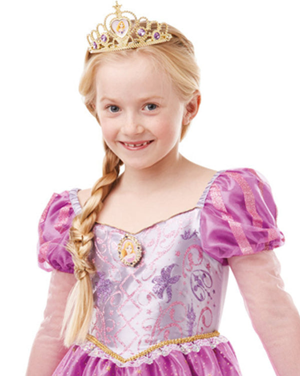 Shine bright just like Rapunzel in this Disney Rapunzel Glitter and Sparkle Girls Costume that's perfect for any magical princess. The costume comes in a purple and pink satin dress featuring puffed sleeved with printed glitter stripe detail, and glittery tulle sleeves. What's more, the costume features a beautiful light purple bodice with glitter printed patterns, gold embroidery and a character motif in the middle of the neckline. The skirt features lovely lace and braid in gold at the waist and has a tulle overlay with glittery print. Finally, a princess tiara is included featuring faux purple jewels and a character art decal to complete the look. Perfect for your little one to dress up in for any Disney party, Book Week and more.