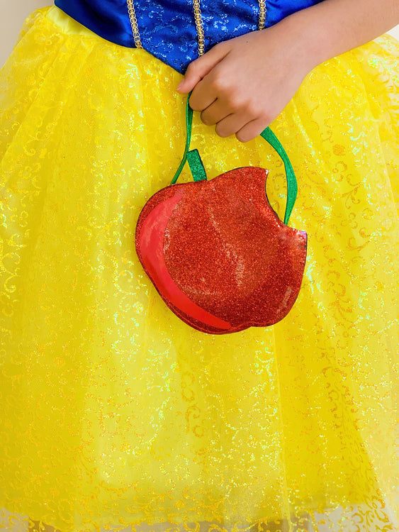 Make sure to complete your Snow White outfit with this stunning Disney Snow White Apple Accessory Bag. The bag comes in the shape of the poison apple with a bite on one side and is a glittery red bag with an attached green glittery strap and plastic piped edging. The bag has a small pouch with a zipper closure at the back for carrying small items. Perfect for completing your Snow White costume for your next Disney Princess party.