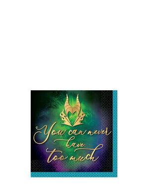 Add an element of evil to your next themed party with these Disney Villains Maleficent Beverage Napkins Pack of 16 . The napkins feature the iconic headpice worn by Maleficent herself with the words "You can never have too much" all in metallic gold. This is all set on a black, green and purple background with a blue boarder on two of the four sides. Combine with our range of Disney Villains party supplies including party cups, party plates, tablecovers and more.