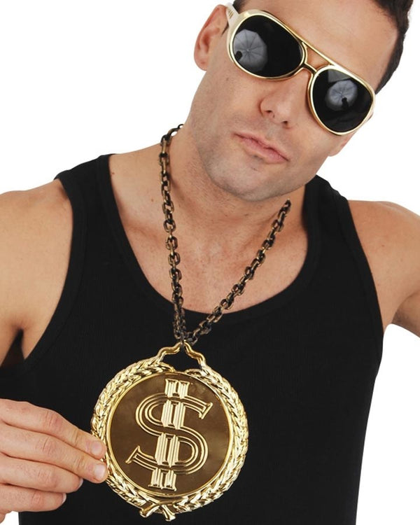 Let everyone know you're in the money with this large gold coloured Dollar Sign Medallion. Wear with any 90's style, pimp or gangster costume.