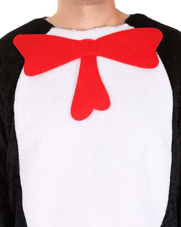 - White plush fabric front inset with large sewn-on red felt bow tie.