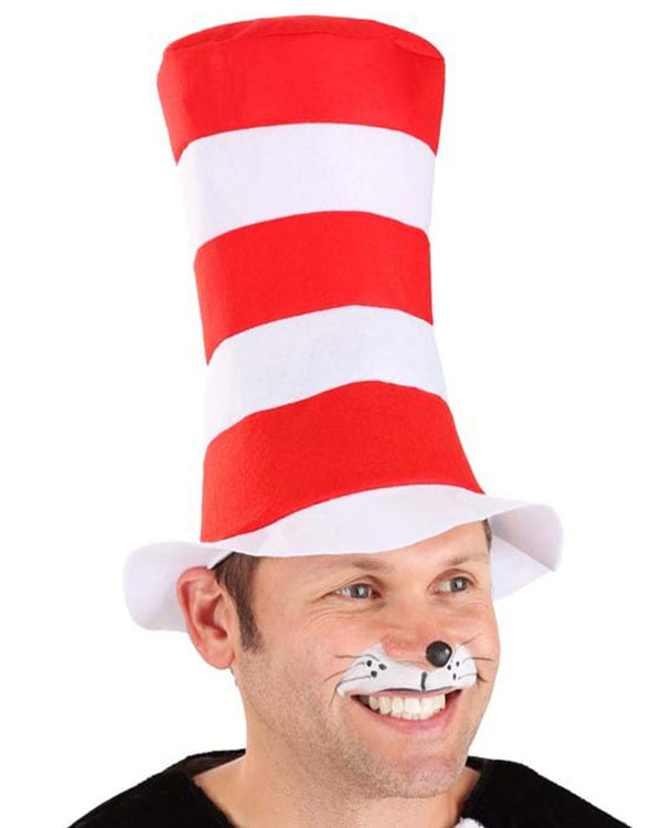 - Tall felt top hat has red and white stripes.