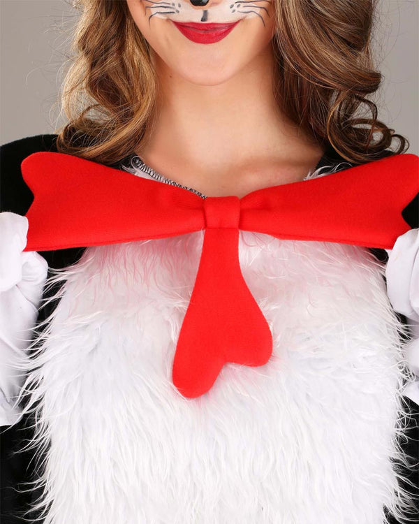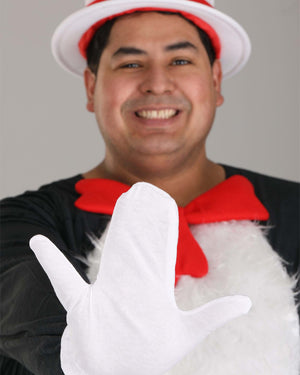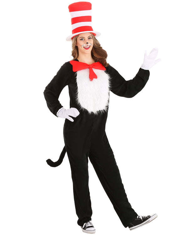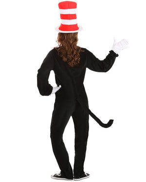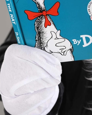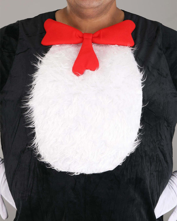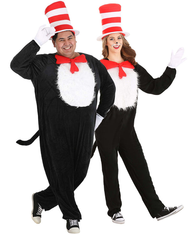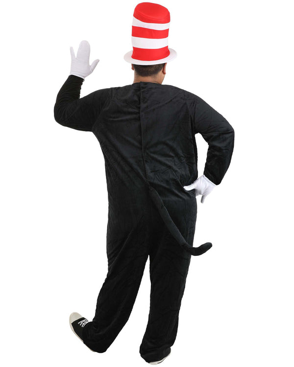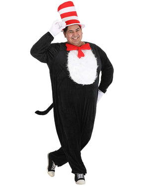 Enter the magical world of Dr Seuss with this picture-perfect Dr Seuss The Cat in the Hat Deluxe Adult Plus Size Costume. This officially licensed, premium costume is a perfect recreation of the cat, straight from the pages of The Cat in the Hat by Dr Seuss. Included is a full-length black velour jumpsuit with hook-and-loop fastener at the centre back and attached black tail, a pair of white gloves, and a large, red-and-white-striped hat. Jumpsuit features a white faux fur belly patch and a large red bow at the neckline–just like the cat wears in the book! Children and adults alike will be delighted to see you in costume and no doubt instantly recognise you as the classic storybook character. If you know how to have fun just about anywhere (and can tidy up afterwards, of course), this is the dress-up for you. Perfect for letter C or Dr Seuss themed events, a twist on an animal theme, kids parties, or for being the star of Book Week.