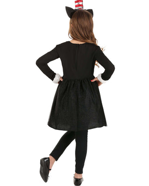 Become one of the most loved book characters for your next fancy dress event with this Dr Seuss The Cat In The Hat Deluxe Girls Costume. This costume includes a long sleeve black dress that features a jersey knit bodice with a white faux fur inset with a metallic red bow tie attached. The skirt features a black glitter tulle. The costume also includes a black headband with two black velvet cat ears and a metallic red and silver foam mini hat in the centre.