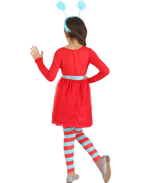 Become one of the most loved book characters for your next fancy dress event with this Dr Seuss Thing 1 and 2 Girls Costume. This costume includes a long sleeve red dress that features a stretch jersey knit bodice with a white and black circular applique on the centre front which reads 'Thing'. The skirt is a layered metallic red mesh knit. The costume also includes a pair of red and light blue striped leggings, a light blue waist sash, a light blue fluffy headband with 2 wire antennae and 2 round medallions at the top. To decide which Thing you are today, there are 2 black numbers to place on the round applique on the dress and 4 numbers for the headband.