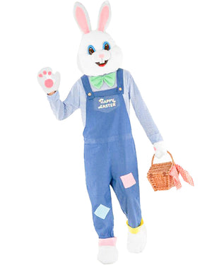 Step up your Easter bunny game with this soft and comfortable Easter Bunny Dungarees Mascot Adult Costume. The costume features a plush bunny suit with blue overalls with colourful patches on the knees and attached blue long sleeves, as well as featuring a mint green bow tie, and mittens with pink paw prints that make you look just like a bunny. The mascot head features the classic cartoon look so it's sure to bring smiles from those young and old this Easter.