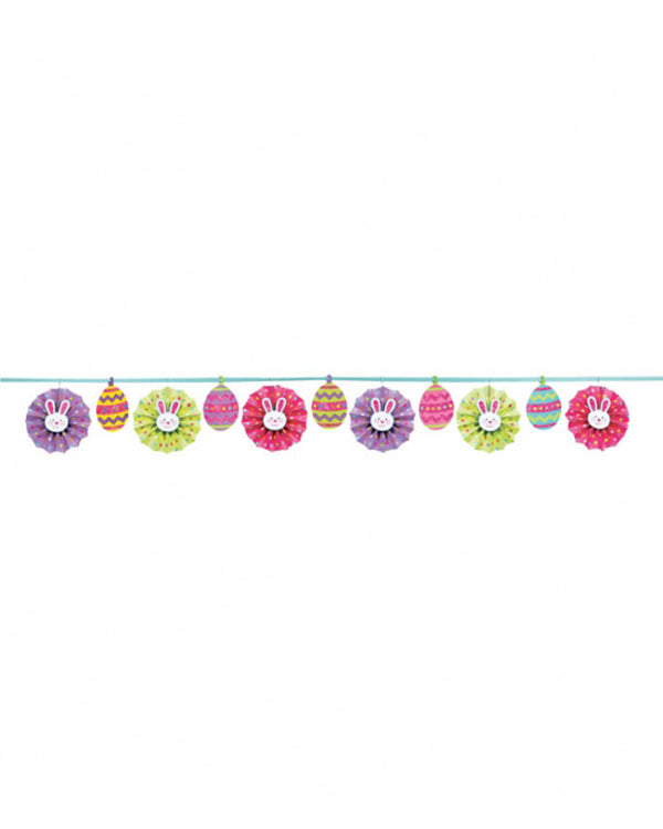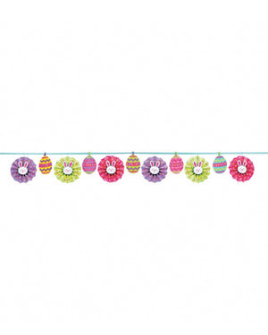 Brighten up your house this Easter with this vibrant Easter Fan Banner Garland with Glitter. This beautiful garland is sure to bring some easter joy with its alternating bunny and easter egg fans in an assortment of different colours including purple, green, pink and yellow all being held up together by a blue piece.