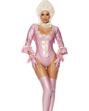 Indulge in decadence with the Eat Cake Womens Costume. This luscious outfit features a bodysuit adorned with delicate white lace trim. Attached garter straps and thigh highs add a cheeky touch to the bodysuit. An attached bolero jacket, complete with ruffle cuffs and elegant white lace trim brings sophistication to the look. The matching waist cincher, decorated with charming bows along the front, enhances your silhouette. Complete the outfit with short fingerless gloves boasting large, flirtatious ruffles. All pieces are in a delicate metallic pink. The perfect outfit if you are looking for something inspired by the infamous Marie Antoinette.