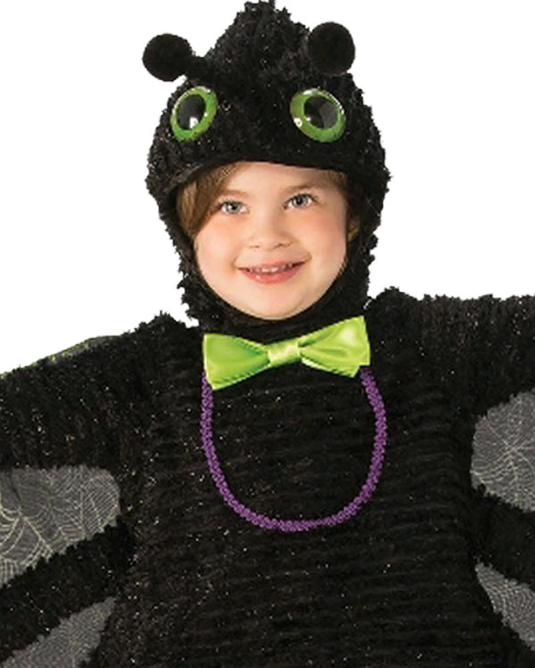 Remember the classic nursery rhyme you used to sing, about the spider? The eensy weensy spider climbed up the water spout. Have your little girl sing this nursery rhyme while dancing in this Eensy Weensy Spider Girls Costume next Halloween or dress up the party. This adorable costume includes a black woven long sleeve top with a touch of glitter fibres. Attached along the sides of the top are four extra legs, which are filled with fibre to give them a 3D effect and on the front of the top is a green bowtie with purple piping underneath. A separate pair of black velvet leggings, to complete the eight legs a spider has. Attached to the back of each of the legs and sleeves is a long grey cape shaped like a web and features white spiderweb printed all over the cape. The headpiece is made out of the same black material as the top and features two big green round eyes on the top and behind the eyes a pair of black antennas. Don't let that rain wash you out!