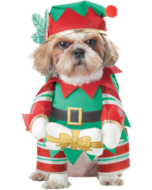 Your dog will look just like one of Santa's little workers with this Elf Pup Pet Costume. Costume comes with a festive stuffed green red and white character bib with a detachable bone. A matching hat is also included to complete the costume. Costume ties around the mane of your dog and fits over the front legs.