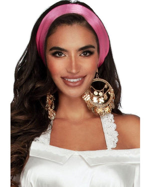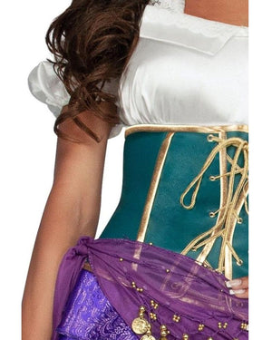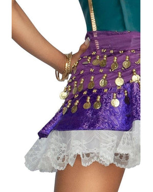 Mesmerise and dazzle your friends as you step out in our Emerald Dancer Womens Costume. This spotlight-worthy costume includes a dress that features a white satin like off the shoulder top with a detachable lace halter neck. There is a large green faux leather corset belt with gold gold accents and gold lacing. The skirt of the dress is a royal purple mini ruffle with white lace along the hem. The finishing touch is the showstopping purple coin skirt. The coin skirt is designed to wrap around your waist and with the cascading attached gold coin, will leave shimmering hues with each step you take.
