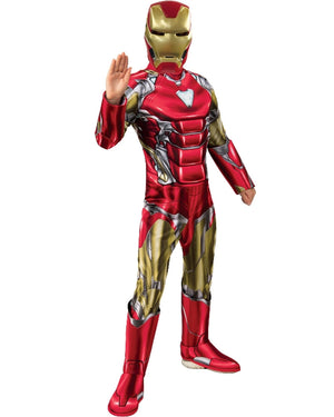 Show your fandom for one of the greatest heroes when you dress in this Endgame Iron Man Deluxe Boys Costume. This costume is based on the suit Iron Man, aka Tony Stark, wears in the last instalment of the Avengers movies and features a red and gold digitally printed jumpsuit with fibre filled to give the illusion of 3D armour, silver detailing and right in the centre of the chest is Tony's arc reactor for powering up the suit. The sleeves also feature attached gauntlets with fibre filling for a 3D effect and attached to the lower legs are red 3D boot covers with elastic which you secure under your shoes. Finish the look with the moulded half mask, which is painted red and gold just like in the movie with elastic around the back to fasten and eye holes to see through. Join Captain America and the rest of the Avengers that survived the 'snap' and team up to have a second chance to defeat the mad titan, Thanos, one more time.