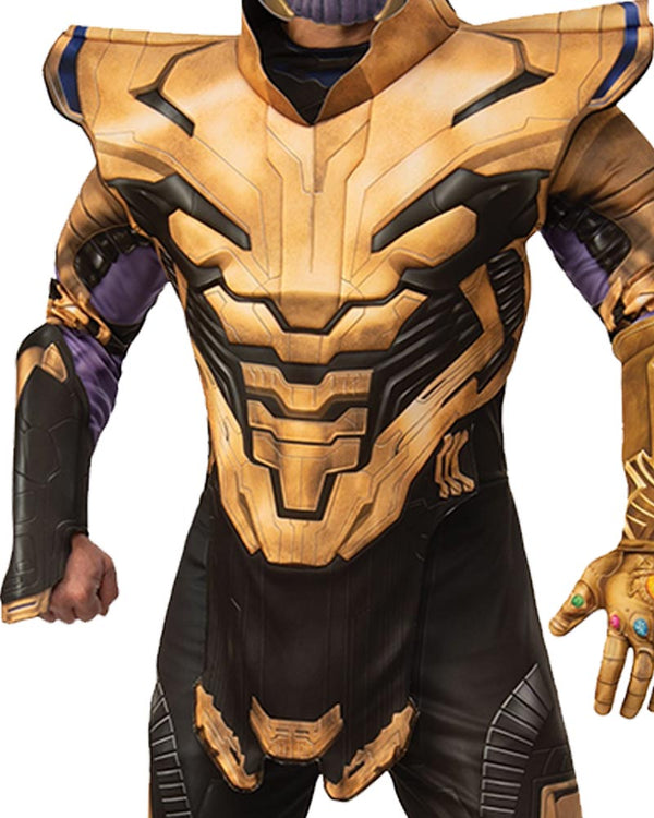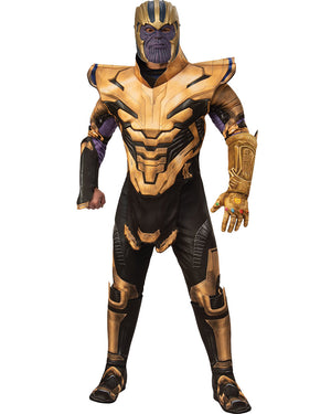 He's the mad titan who believed the universe needed to be cleansed and was able to achieve this with just a snap of his fingers, well now you can become one Marvels maddest villain when you dress in this Endgame Thanos Deluxe Mens Costume. Based off Thanos's look from the highly anticipated film Avengers: Endgame, this costume will guarantee to turn some heads at the next dress-up event. Costume includes a long sleeve gold and black digitally printed armored jumpsuit with fiber filling in chest and padding in sleeves to give the illusion your wearing armor. Gold chest piece features 3D shoulders and padding which sits over the jumpsuit. At the bottom of the pants are two attached 3D boot tops with digitally printed gold armor and an elastic straps which slip under your shoes. Includes the Infinity Gauntlet, which is foam backed and digitally printed detailing with printed Infinity Stones in the knuckles. To complete the look is a molded EVA mask that covers the face with an elastic strap at the back and is design to replicate Thanos' unmistakeable face. With his superhuman strength, agility and the power of the Infinity Gauntlet there's no stopping this Titan.