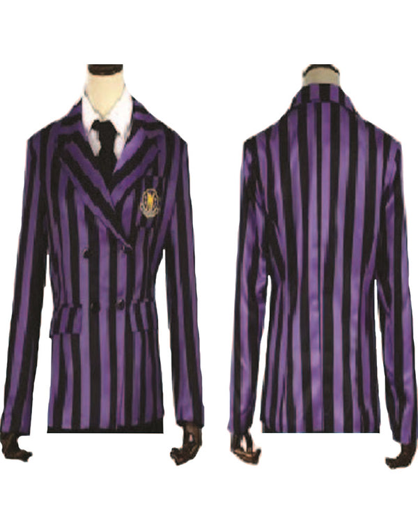 - Printed black and purple striped uniform blazer.