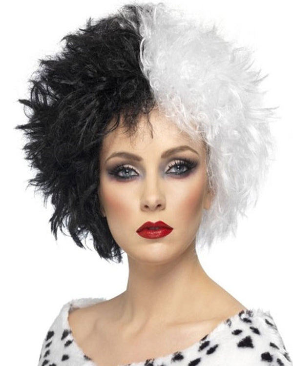 This Evil Madame Wig is a must to finish off any wicked woman costume. This great wig features a split black on one side and white on the other side.