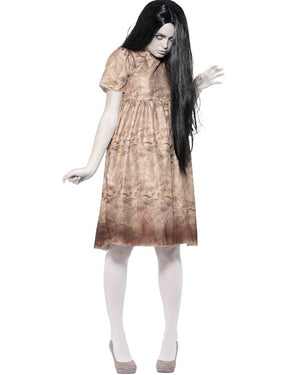 Show that nothing's creepier than a possessed child while you're wearing our Evil Spirit Womens Costume. Featuring a knee-length dress styled as a tattered, dirty old dress with short puffed sleeves and a high neckline in addition to old browning blood stains along the hem! The hems of the sleeves and skirt are slightly frayed to give that extra look of authenticity. The more they fray, the more disheveled you'll look and convince everyone you're a haunting spirit. Plus the costume features a long black wig with a middle part. To complete the costume add white stockings, a wig cap, contact lenses, and even a bit of blood! Your victims will know their 7 days is up!