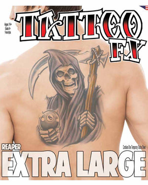 If you want an instant tattoo solution for your Halloween costume look, then this Extra Large Grim Reaper Tattoo is just the thing. Easy to apply, with colours that mimic real tattoo ink and designs that look just like are actually on your skin. Very realistic so you can fool your friends.