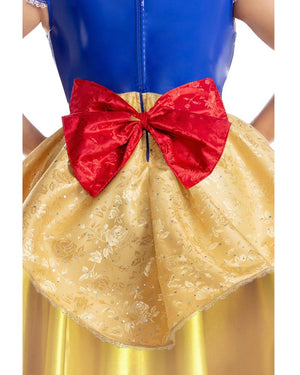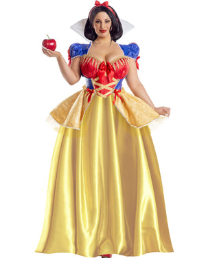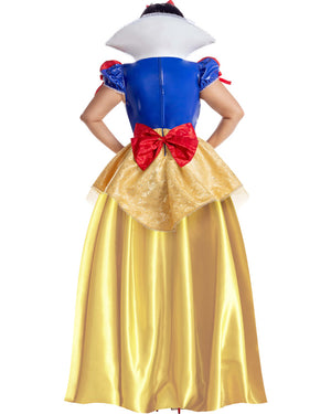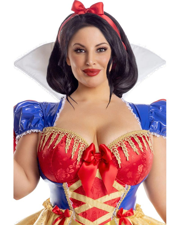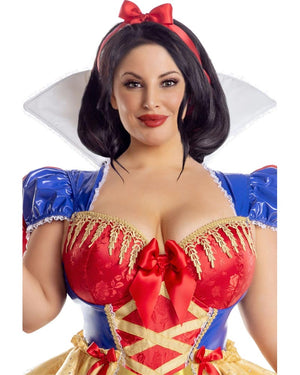 Bring your favourite fairytale princess to life in our unforgettable Fairest Princess Premium Plus Size Womens Costume. This elegant costume includes a floor length vinyl with a blue bodice and accents. The bust is red with a red bow in the centre with gold lace. Down the centre of the chest is a red panel with printed gold lacing. At the waist of the gown is a peplum skirt of rose print fabric with touches of glitter, embellished with gold accents and small red bows. For regal elegance and a touch of grandeur, there is an included large high-neck white collar to attach to the back, a large red bow also for around the back for a touch of whimsical and a touch of inicents is a red headband.