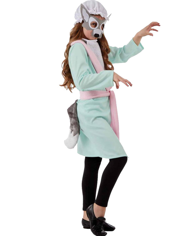 Almost trick your friends into thinking you're a sweet old Grandma when you dress in this Fairytale Wolf Kids Costume, at your next Book Week or any dress up event. This comfy and hilarious costume includes a pale green plush dressing gown, pale pink tie belt, detachable grey plush wolf tail for around the back, grey and white wolf mask with pointed ears and black button nose, plush grey bib and a white bonnet to help disguise yourself as a sweet old granny. This costume is so comfy, you could easily wear it all day long. Keep an eye out for that brave little Red Riding Hood, off to visit her Grandma'.