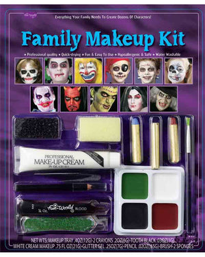 This great value Family Make Up Kit has everything you need for a huge variety of make up looks.This huge kit includes a 4 colour make up tray, crayons, tooth wax, pencil, professional make up cream, glitter gel, theatrical blood, sponges and a brush. The sky is the limit - create skeletons, devils, clowns, pirates, monsters, puppy dogs or vampires!