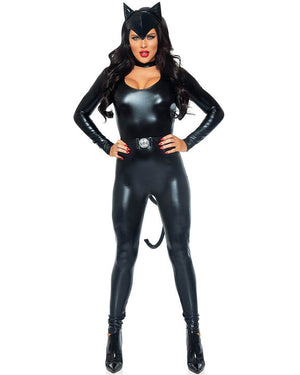 This is one cat that isn't happy to lie around the house, she's looking for a spot of mischief, and this Feline Femme Fatale costume is the perfect thing to do it in. A three-piece outfit with headpiece and belt, the jumpsuit has a built-in the collar, and the leather-look material is nice and stretchy.