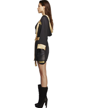 Knock the socks of your friends and step into the ring when you show off your fighting skills in this Fever Knockout Womens Costume and have your friends seeing stars. This boxing costume comes with a black crop top, a pair of shorts with a gold waistband and 'knockout' printed on the front, a black hooded jacket with gold edging and a gold waist tie and to finish the look a pair of black gloves that are fibre-filled to took like padded boxing gloves. Practice your punching technique and dodging or your opponent will have small birds circling and tweeting around their head. Remember to wait for the bell before throwing the first punch. KAPOW!