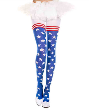 These Flag Print Spandex Pantyhose are the perfect 4th of July accessory! These pantyhose have white tops with red and white stripes around the thigh and are blue from the thigh down with a white star pattern. You're sure to attract attention with legs like these!
