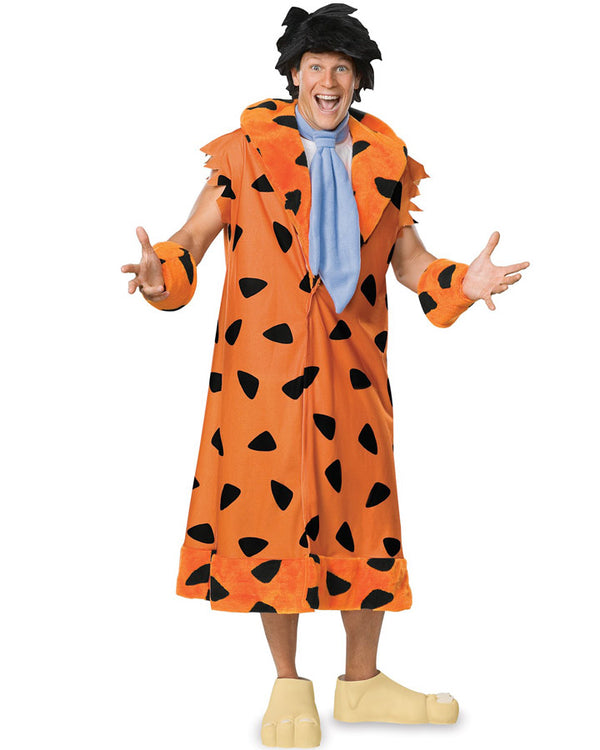 Be the coolest guy and everyone's favourite caveman from the stoneage, Mr Frederick. J. Flintstone. He's the steak lovin', yabba dabba doo cheering all rounder! This Flintstones Fred Flintstone Deluxe Mens Costume comes with an oversized orange polar fleece tunic with black stones printed all over with a orange faux fur lapel, matching orange faux fur cuffs, an oversized light blue polar fleece tie, black polyester fibre wig and EVA foam oversized feet which secure over your shoes with velcro. Perfect all round costume for any party.