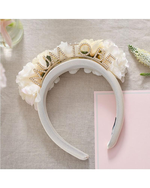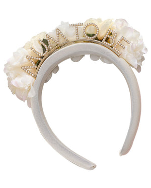 Crown the moment with this stunning Floral Baby Headband. This white headband features a gold-toned "Mum to Be" motif adorned with delicate pearl accents and charming white floral embellishments. A graceful accessory for a beautiful celebration of motherhood.