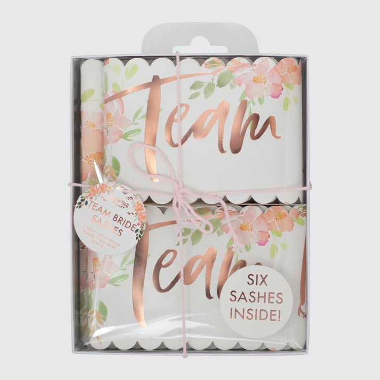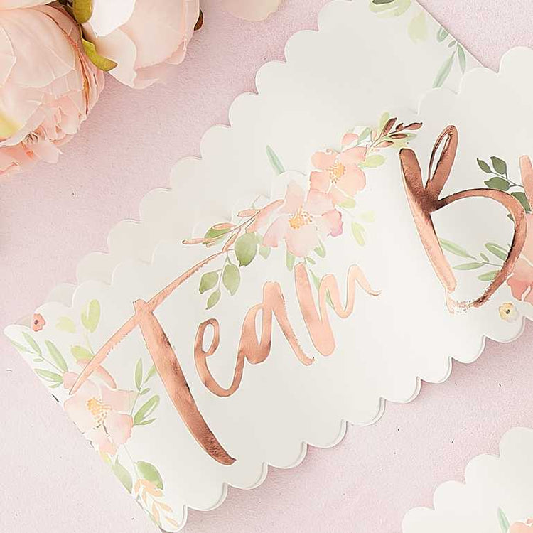 Make sure all the hens are looking the party with our Floral Hen Party Team Bride Sashes Pack of 6. Featuring a pack of 6 durable paper sashes styled with the words Team Bride in copper, green floral and pink flowers. One size fits all!