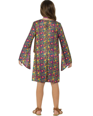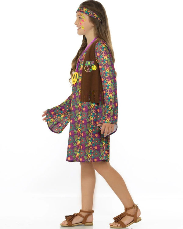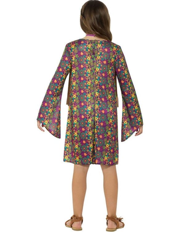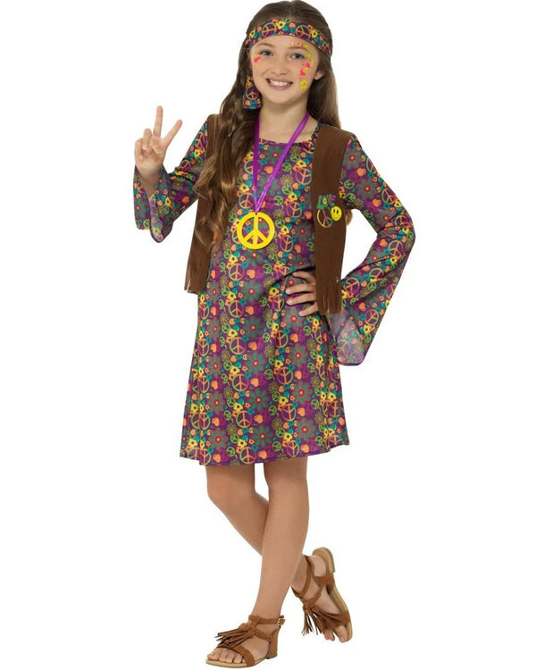 You'll be dressed and ready for Woodstock when you wear this Flower Hippie Girls Costume. The costume includes a multicolored dress with trumpet sleeves and images of peace signs, flowers and more throughout. Attached to the dress is a brown waistcoat with tasseled edges and printed badges. To complete the look also included is a matching colourful headband as well as yellow peace sign necklace.