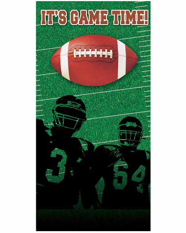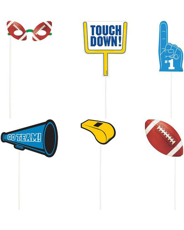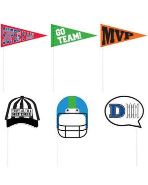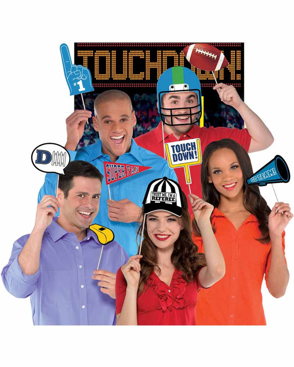 Use this Football Photobooth and Props Pack of 14 at your little boy's sports party to create memories that'll last a lifetime! This pack includes 2 backdrops; 1 in front of a goal post and 1 on the field and 12 props. The props consist of 3 flags, a helmet, a referee hat, a goal post, a megaphone, a football, a speech bubble, a foam finger, a pair of glasses and a whistle. Each prop is atttached to a plastic stick so you can hold the prop whilst striking a pose. Hours of fun!