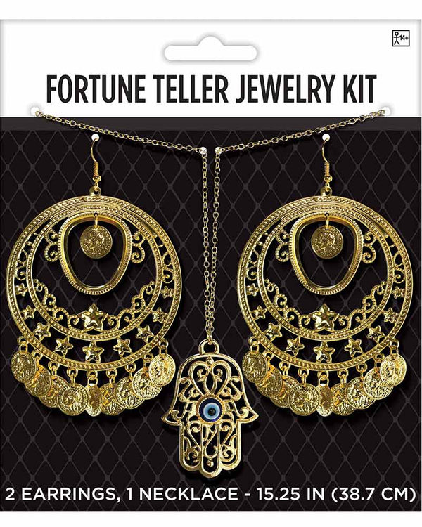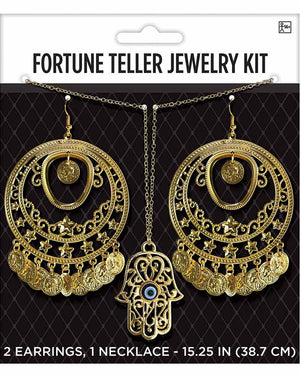 Complete your fortune or future telling outfit with this Fortune Teller Earrings and Necklace Jewellery Set. These face jewels are designed to sit around the top part of your face. Jewels come in colours of silver, blue, gold and purple and feature a variety of different shaped jewels and in the centre is a blue eye with gold iris.