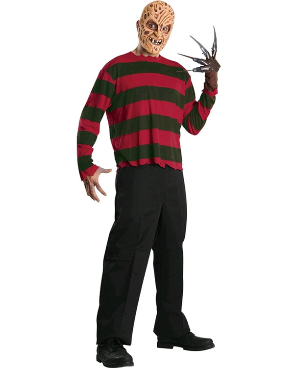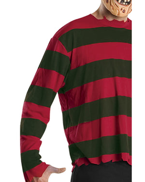Invade people's dreams this Halloween with our Freddy Krueger Shirt and Mask Adult Costume. The terrifying costume is an officially licensed Freddy Krueger costume including an iconic red and green shirt and a half mask with printed burns all over!