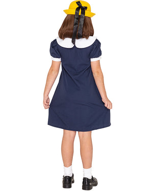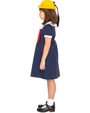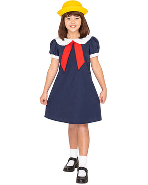 Your little one will love this French School Girl Deluxe Girls Costume that's inspired by everyone's favourite French girl from the beloved Ludwig Bemelmans book Madeline (and later the iconic 90s cartoon series). This cute costume has been designed exclusively and is made from a comfortable poly-cotton blended material. The costume includes a navy blue A-line dress featuring button closure at the back and short puffed sleeves with white cuffs, a white Peter Pan collar, and a red knot fabric sash attached to the collar at the front. To complete this cute costume a yellow hat with black ribbon is included. Our exclusive CostumeBox design will be a winner at your child's next Book Week parade or fancy dress party.