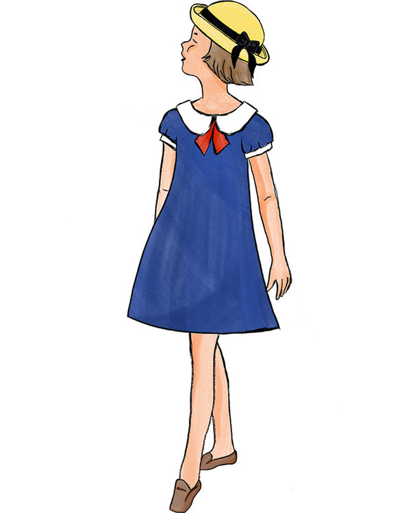 - Navy blue A-line dress with a white Peter Pan collar.