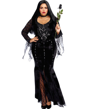 Become a dark and mysterious beauty and walk into the party dressed in this elegant Frightfully Beautiful Womens Plus Size Costume. A sinister gown that's bound to turn a few heads. Features a black velvet fishtail shaped dress with a soft V-neckline and silver sequin detailing along the front, sheer black long sleeves with draping cuffs and black sheer lace panels along the knee down.